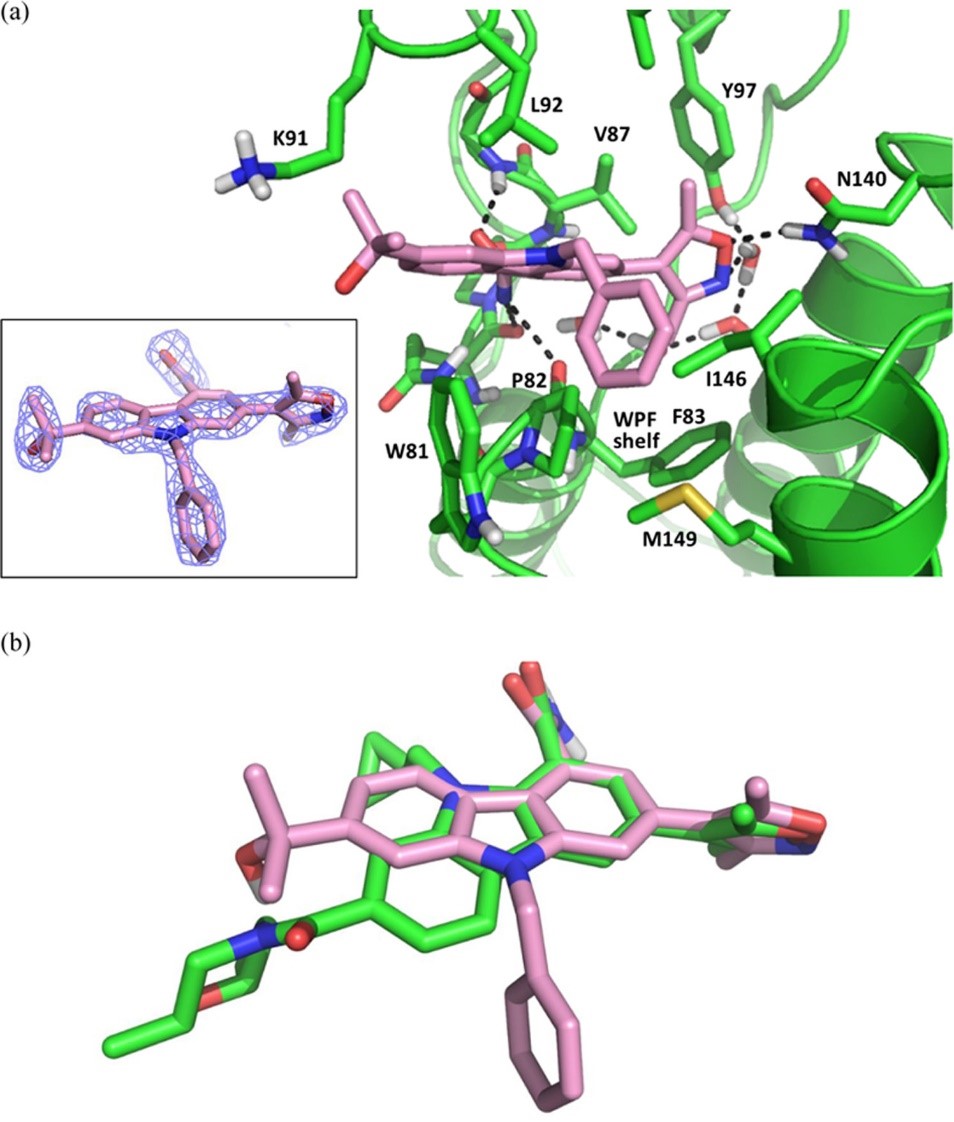 1)异噁唑的氮原子与Tyr113形成水介导的氢键相互作用,而氧原子与 Asn156 的侧链氨基形成氢键。异恶唑环夹在Val103和Ile162的疏水侧链之间,二甲基导致相对于咔唑基团的非平面性,从而模拟乙酰化组蛋白赖氨酸的甲基之一与Phe99形成有利的相互作用。