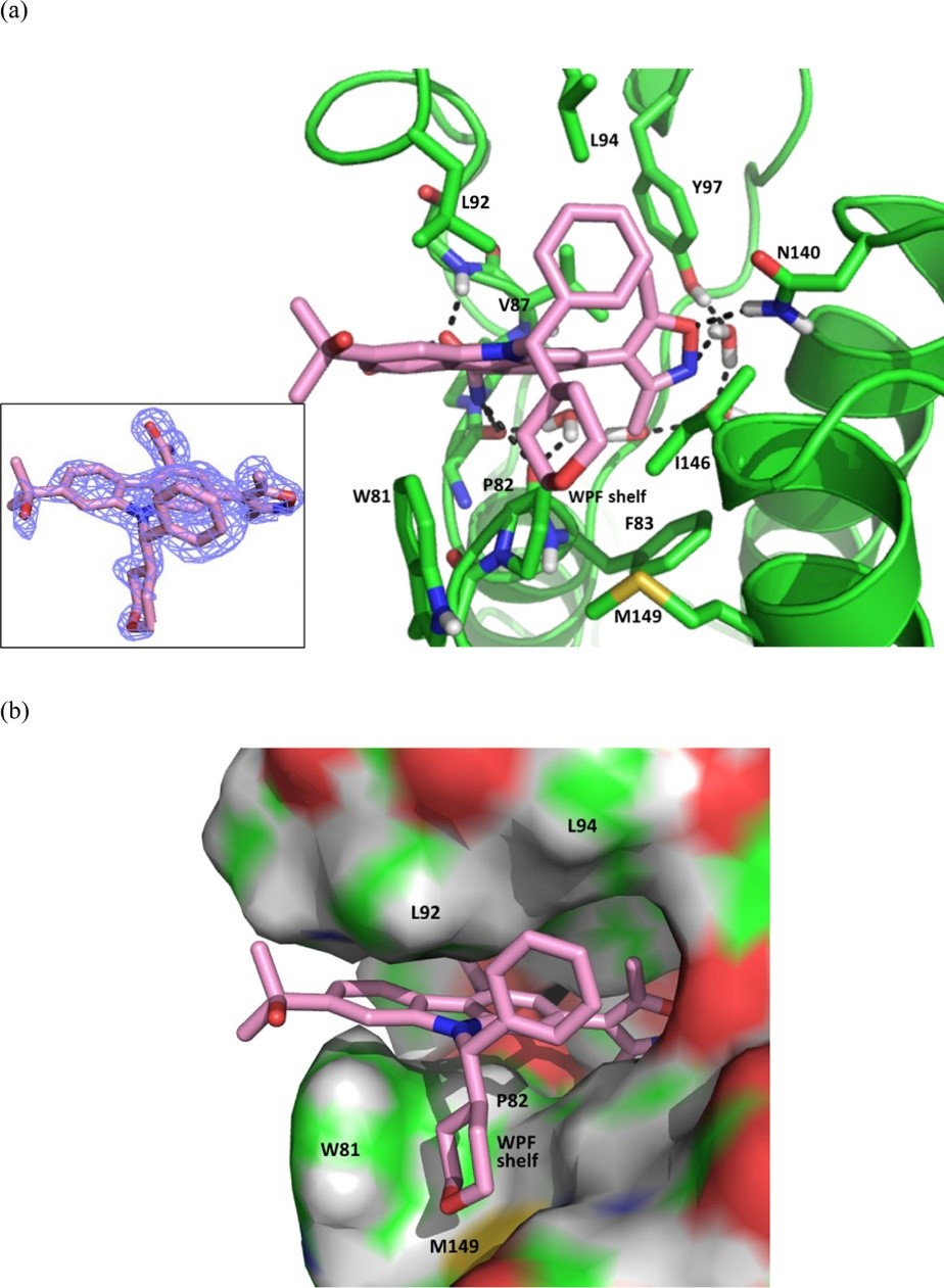 Figure 4. Compd 15与BRD4 (BD1) X 射线结构。(a) 乙酰化赖氨酸结合位点的特写。(b)蛋白质的表面表示,突出显示 ZA-loop和 WPF 区域口袋。