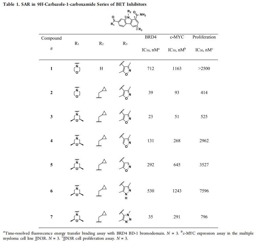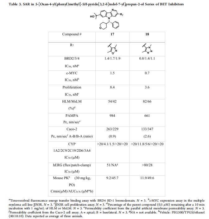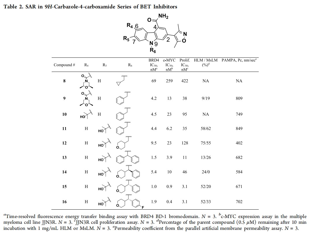 晶体结构的详细分析表明,如果咔唑氮面向WPF架,同时通过二甲基异噁唑和Compd 3 中的伯酰胺保持与BET溴结构域的关键相互作用,则可以方便地接近WPF 架。这种骨架跃迁产生了新的咔唑系列化合物:在2和4位具有二甲基异噁唑和伯甲酰胺(Table 2)。该系列化合物构效关系讨论如下: