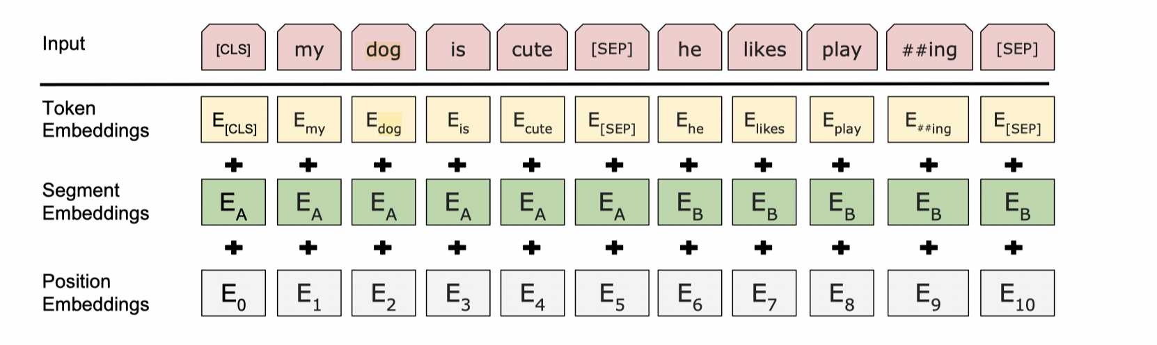 - 此外还需要一个Segment Embedding用于让模型判断上下句,如上面图中的“A”和“B”;