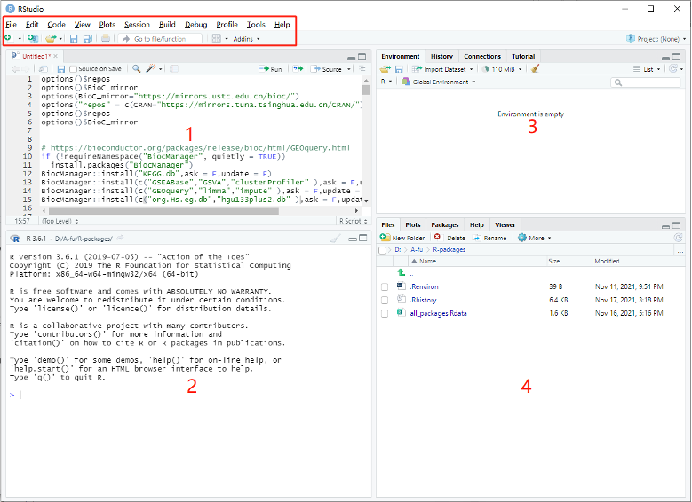 Rstudio的界面分为4个区域,以及顶部的菜单栏。