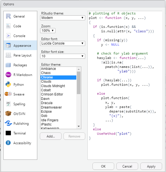 Tools > Global Option > Appearance 设置Rstudio的主题