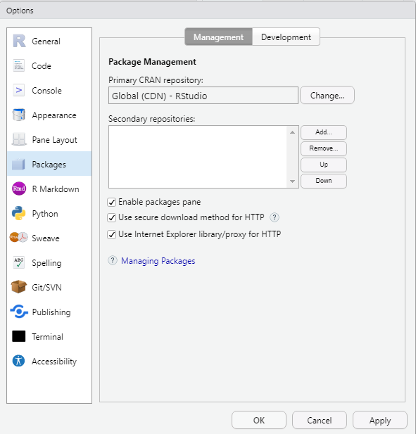 Tools > Global Option > Packages 设置R包的镜像,有时候R包安装不成功,在这里换一个镜像试试。